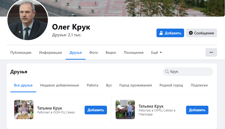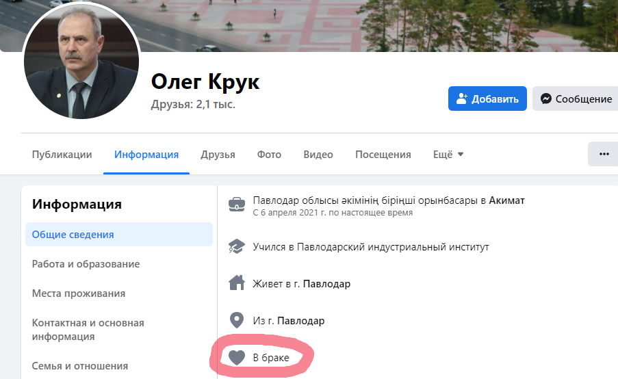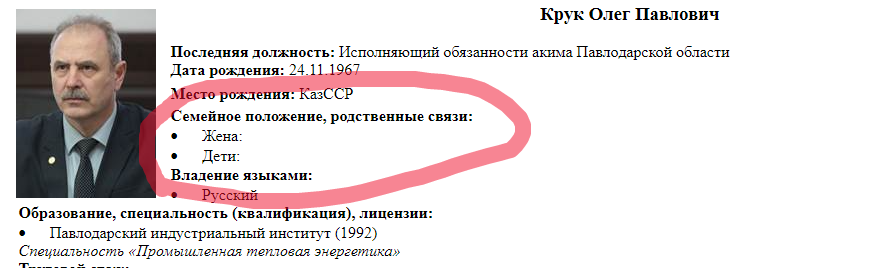 Возможно, это стало традицией в Павлодарской области, но у Олега Крука, как и у Аяна Бейсекина, в персональной справке не указаны жена и дети. Тем не менее на его странице Facebook написано, что он состоит в браке, и у него в друзьях есть две страницы некой Татьяны Крук, которая, предположительно, может быть дочерью или племянницей Олега Павловича: