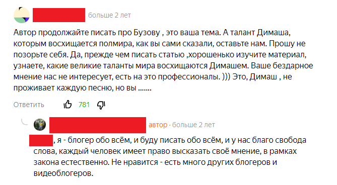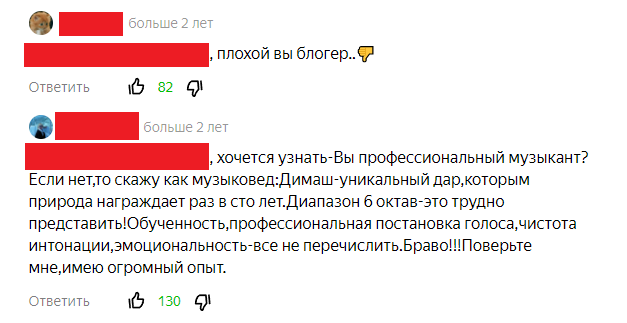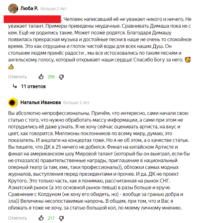 «Сегодня я хочу обсудить такого певца, как Димаш Кудайбергенов, по которому уже полмира сходит с ума. Да, голос действительно уникальный, не спорю с этим фактом. Но какой из него артист? Мягко говоря, никакой. Заглянешь в глаза во время выступления с той же «Любовь похожая на сон» Аллы Пугачевой, а там… свет выключили, а включить забыли… пустота, да и только. Допустим, это кавер-версия, не его песня, и он, в силу своей молодости, еще не так ее переживает, можно понять. Но у него такой же пустой взгляд, когда он поет свои песни, к примеру, «Любовь уставших лебедей», которая была написана специально для него и под него! Как так? Кстати, когда я ее слышу, мне хочется сразу пропеть песню Стаса Михайлова «Журавли летят в Китай». Я понимаю, что песни полярно разные, но блин… Димаш – хорошо пропиаренный проект Игоря Крутого. Именно проект, а не артист. Такой некий Витас №2, но Витас быстро образумился в свое время и стал петь нормальные песни, нормальным голосом, и еще Витас всегда делал и делает интересные вещи своим голосом, его приятно и интересно слушать. А Димаша приятно слушать только тогда, когда он поет низким голосом, и то, только голос и приятно слушать, потому что смысл песен он эмоционально не передает. Никак. Ни голосом, ни взглядом, ни жестами. Как робот. Это крайне прискорбно, потому что у Димаша все для хорошей популярности есть, голос, внешность, вот только артистического дара Боженька недодал, ну, или не научили умные люди. Но, возможно, научат в будущем. Ведь он еще совсем молодой.