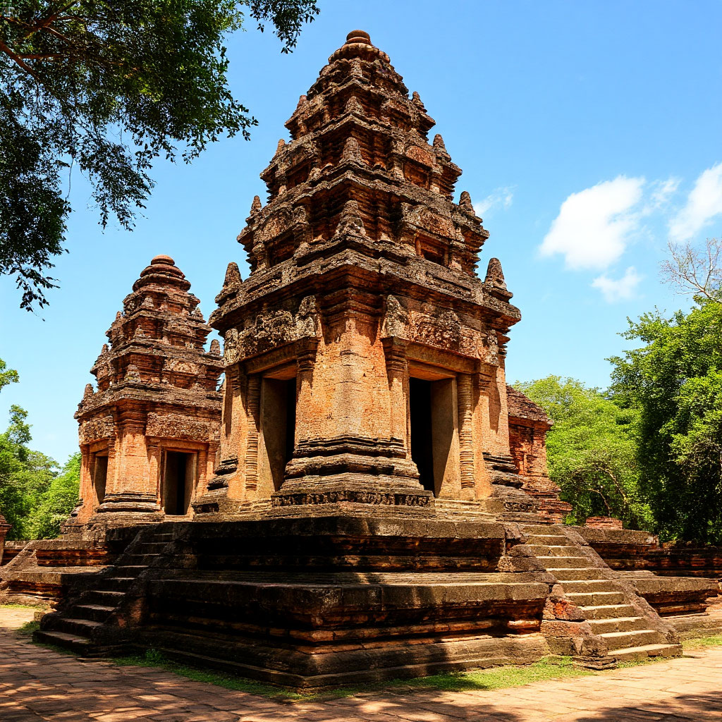 В буддизме и индуизме семь — сакральное число, поэтому была распространена традиция ставить семь небольших храмов в одном месте. Изображение сгенерировано нейросетью.