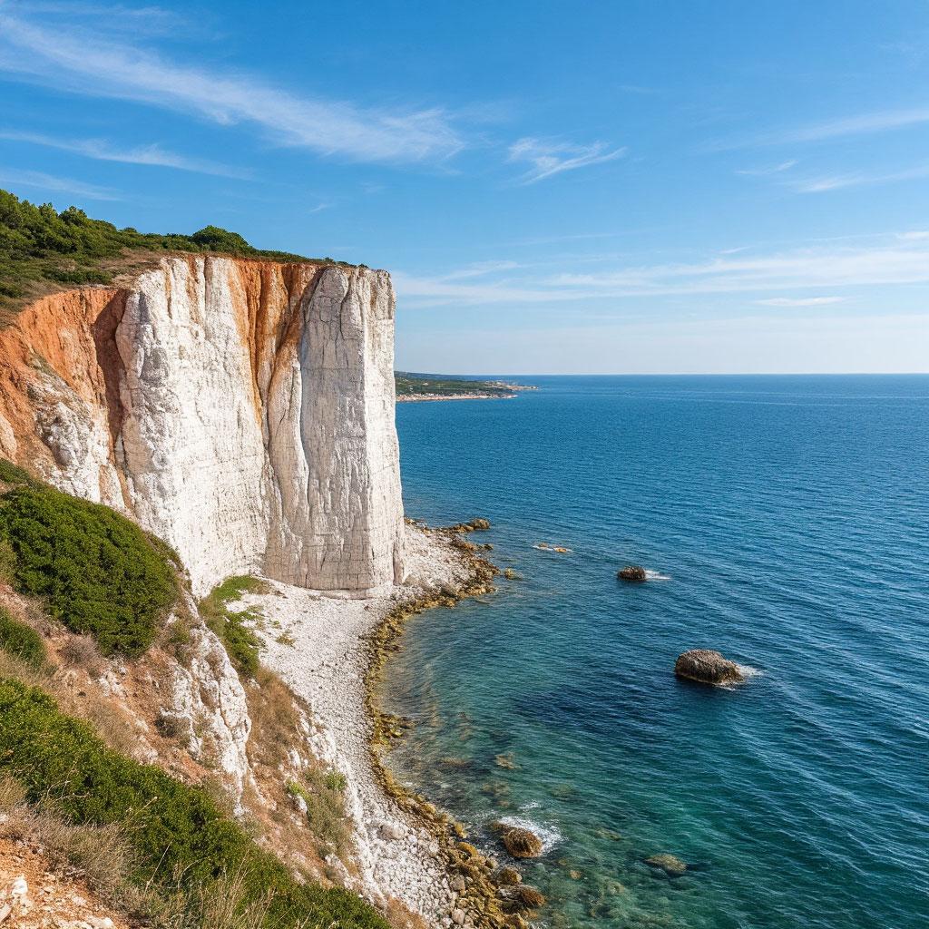 Скалы на побережье Актау заметны издалека. Именно они и дали нынешнее имя городу. Изображение сгенерировано нейросетью.