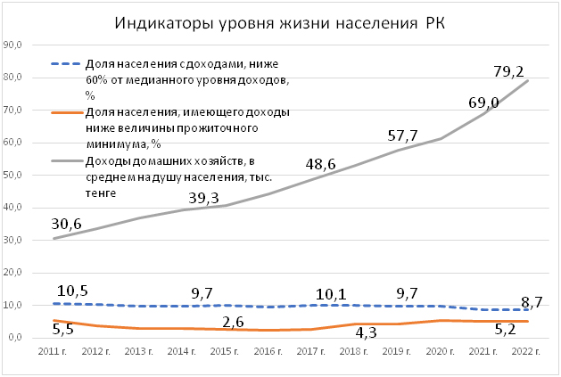 По методологии Организации экономического сотрудничества и развития (ОЭСР), к среднему классу относятся домохозяйства с доходом от 75 % от медианного национального дохода. Тогда в Казахстане доля населения с доходами ниже 60 %, по методологии Бюро нацстатистики, от медианного уровня доходов (157,8 тыс. тенге в 2021 году) составляет меньше 10 %. Среднедушевые номинальные доходы населения составляют 127 тыс. тенге. То есть к среднему классу можно отнести 80-90 % населения страны.