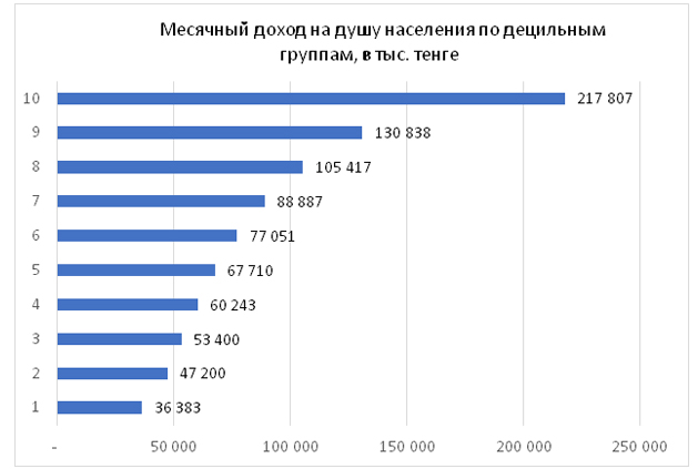 Это доходы всего населения Казахстана, разбитого на группы по 10 %. И здесь видно, что только у одного из 10 жителей страны доход выше, чем медиана. Одним махом можно отнести 90 % казахстанцев к бедным. А к среднему можно отнести только владельцев бизнеса или классных специалистов. А учитывая, что доходы в городе всегда выше, чем на селе, то основная масса бедняков проживает на селе или собирается переехать в города.