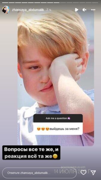 Один из подписчиков Асаубаевой отправил ей несколько разных сообщений: «Влюблен в тебя уже второй год», «Выходи за меня?», «Выходишь за меня замуж?». Бибисара ответила следующим образом: «Много признаний и предложений за пару часов» и также оставила смеющийся эмодзи.