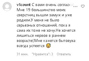 "С вами очень согласна! Мне 19, большинство моих сверстниц вышли замуж и уже родили. У меня не было серьезных отношений, пока я сама их тоже не хочу. Не хочется лишиться нервов в раннем возрасте. Мне кажется бытовуха всегда успеется" — пишет пользователь v1count.