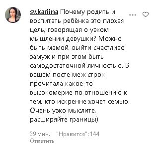 "Почему родить и воспитать ребенка это плохая цель, говорящая об узком мышлении девушки? Можно быть мамой, выйти счастливо замуж и при этом быть самодостаточной личностью. В вашем посте между строк прочитала какое-то высокомерие по отношению к тем, кто искренне хочет семью. Очень узко мыслите, расширяйте границы" — пишет sv.kariina