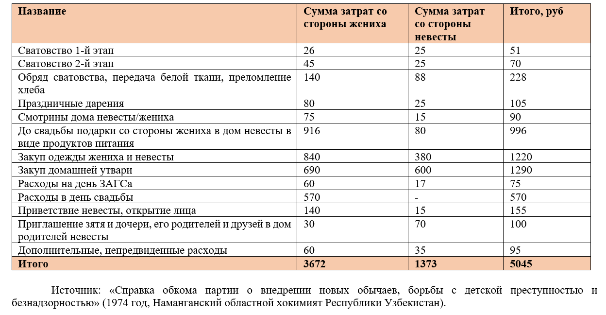 Следует отметить, что в 1974 году доллар стоил 73 копейки, то есть затраты на свадьбу были порядка 4 тыс долларов. С того времени расходы на торжество выросли в 3-4 раза. Исследователь отметил, что сейчас в качестве главного атрибута дарообмена на узбекской свадьбе стала мебель.