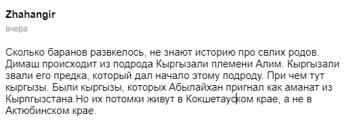 Авторы материала нашли несколько источников информации, которые подтверждают, что кыргызы осели в Казахстане в XVIII веке и достаточно быстро и безболезненно ассимилировались с казахами. В качестве примера они приводят материалы под названием "Кто они?" за авторством казахстанского краеведа и статью под названием “Алимовские кыргызы” от 11 июля, где ученый, этнограф, доктор исторических наук Рахим Бекназаров дает разъяснение о появлении этого племени в Актюбинской области.
