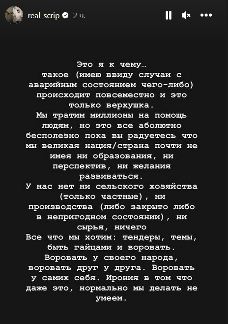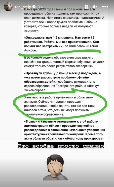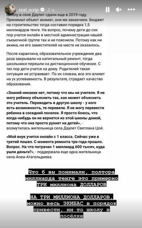 "Чтоб вы понимали, полтора миллиарда тенге это примерно три миллиона долларов. На три миллиона долларов можно весь Экибастуз в порядок привести, не то что школу в поселке", — написал артист.