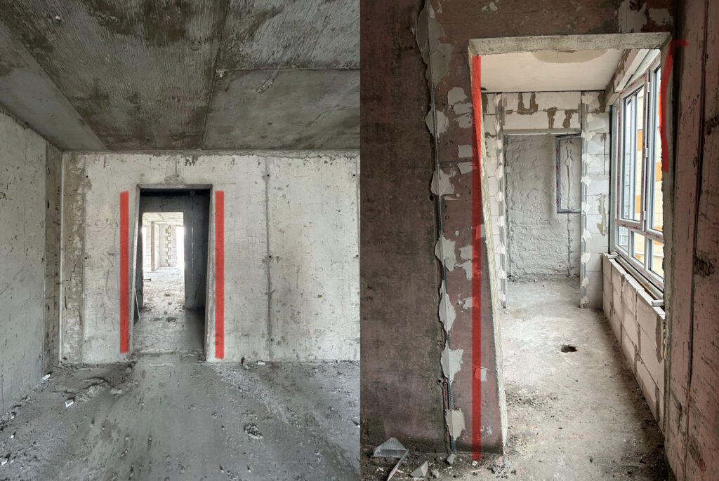 Я посмотрел и ужаснулся. Ответственные монолитные ж/б конструкции возведены с грубейшими нарушениями. У меня такое ощущение, что опалубку выставляли с пьяных глаз, в итоге получились кривые и косые дверные проемы, которые больше похожи на параллелепипед, нежели на прямоугольник. Про кривые колонны тоже молчу.