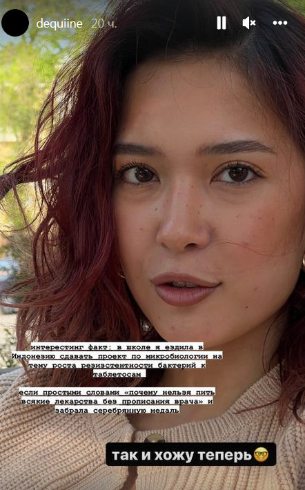 "Интереный факт: в школе я ездила в Индонезию делать проект по микробиологии на тему роста резиснтентности бактерий к таблеткам. Если простыми словами — почему нельзя пить всякие лекарства без предписания врача. Забрала серебряную медаль. Так и хожу теперь", — объяснила певица нежелание пить антиибиотики без необходимости.