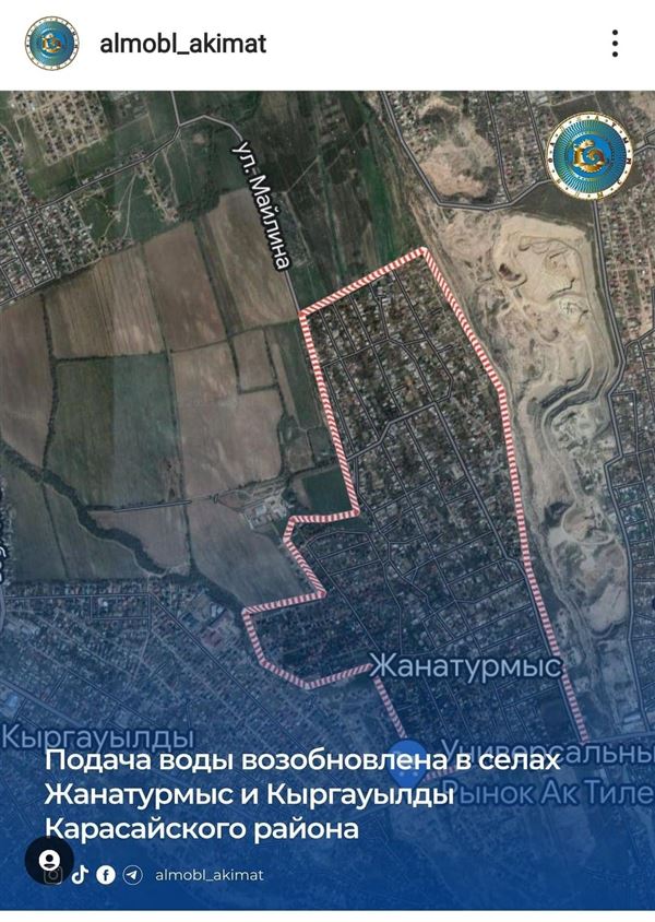 Между тем на странице акимата Алматинской области в Instagram еще несколько дней назад появилось сообщение о том, что подача воды возобновлена в селах Жанатурмыс и Кыргауылды Карасайского района. После о главной беде района — ни слова!