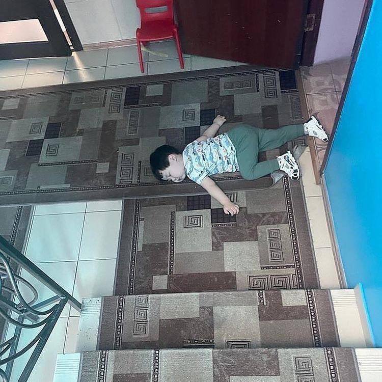 Есть и фото ребенка, который в одиночестве лежит лицом на полу возле лестницы.
