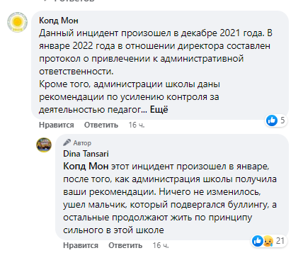 На это Тансари ответила: "Этот инцидент произошел в январе, после того, как администрация школы получила ваши рекомендации. Ничего не изменилось, ушел мальчик, который подвергался буллингу, а остальные продолжают жить по принципу сильного в этой школе".