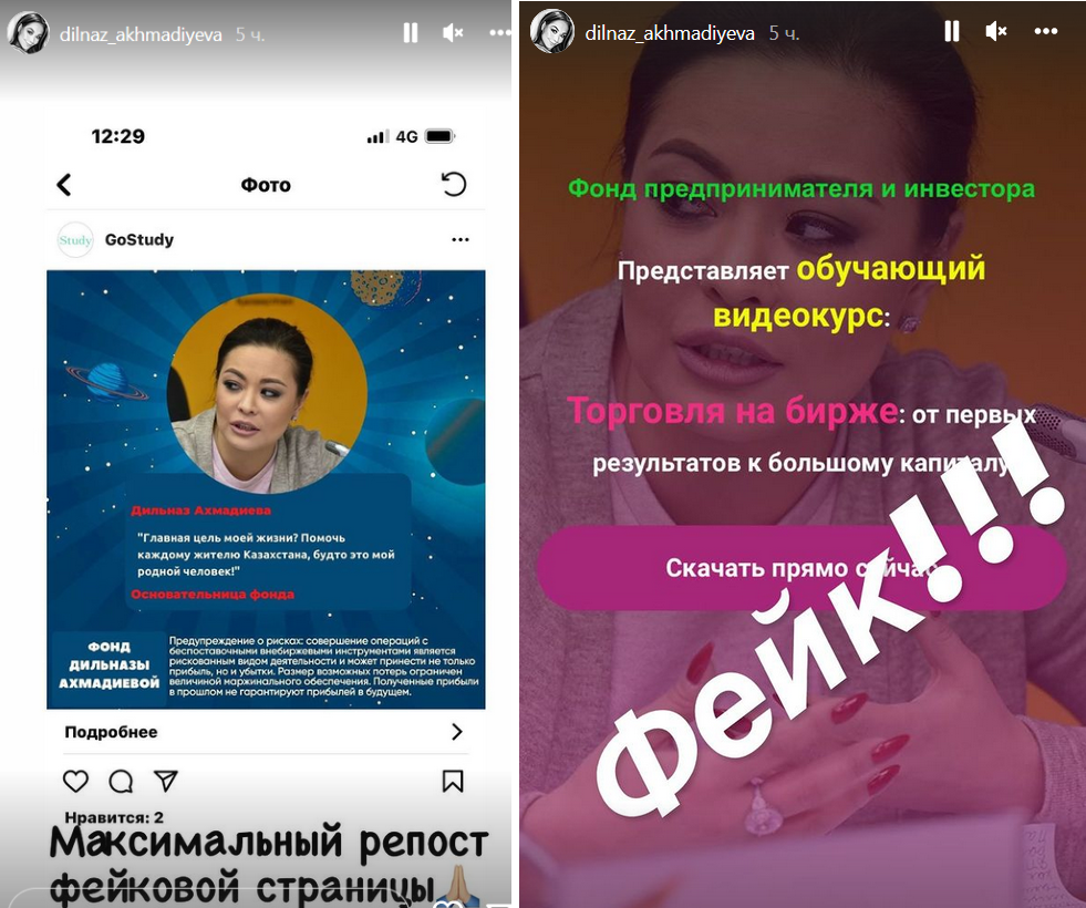 "Какой-то фейк-аккаунт создал мой фонд, которого не существует, и написал "фонд Дильназы Ахмадиевой". Мое имя не склоняется. Нет понятия "Дильназа", "Дильназу", "Дильназой", и фонда тоже нет! Не ведитесь на мошенников, очень вас прошу", — сказала певица в сторис.