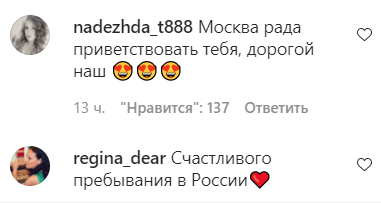 "Москва рада приветствовать тебя, дорогой наш", "Счастливого пребывания в России", — пишут поклонницы под фотографией.