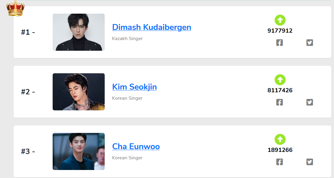На данный момент тройка лидеров выглядит следующим образом: единственный представитель Казахстана в рейтинге — Димаш Кудайберген и два корейских певца, Ким Сокджин из BTS и Ча Ыну из группы Astro.