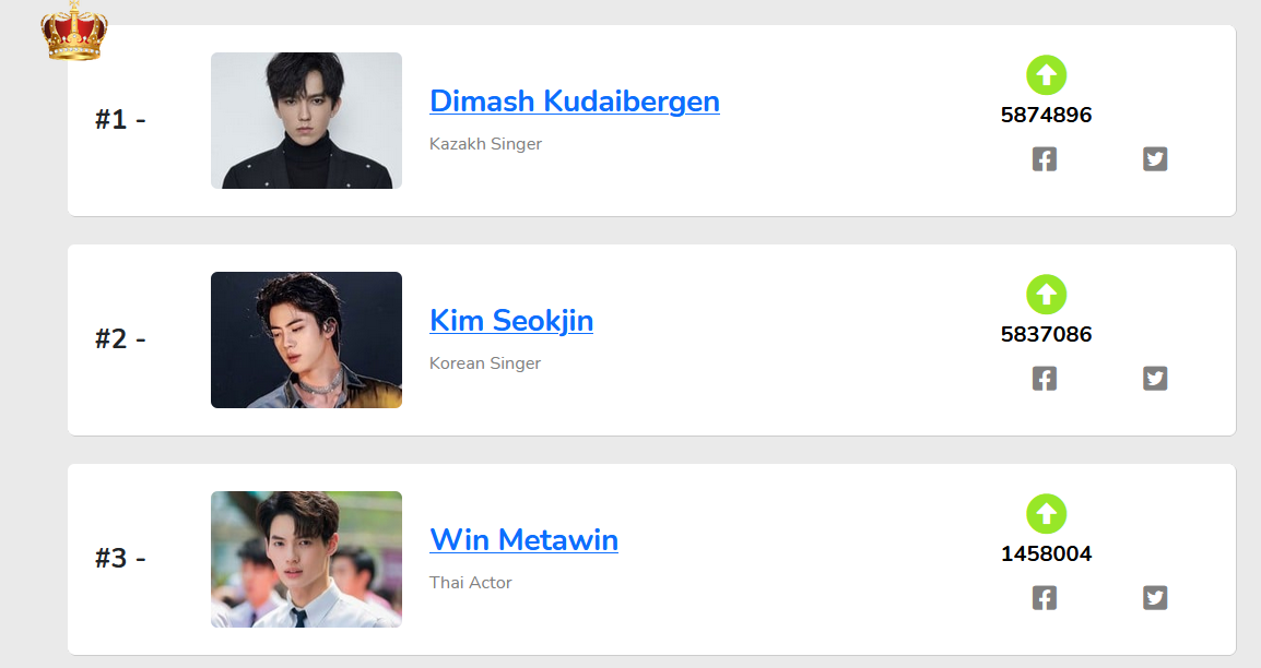 Всего за казахстанского певца проголосовали почти 5,9 млн человек, сообщает Caravan.kz. В рейтинге участвуют представители шоу-бизнеса Кореи, Китая, Тайваня, Гонконга, Таиланда, Японии, Филиппин. Казахстан представлен только Димашем, которого горячо поддерживают фанаты.