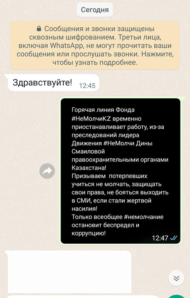 Тансари показала, какой ответ теперь получают обратившиеся в фонд за помощью: "Горячая линия временно приостанавливет работу из-за преследований лидера движения Дины Смаиловой правоохранительными органами Казахстана! Призываем потерпевших учиться не молчать, защищать свои права, не бояться выходить в СМИ, если стали жертвой насилия!"