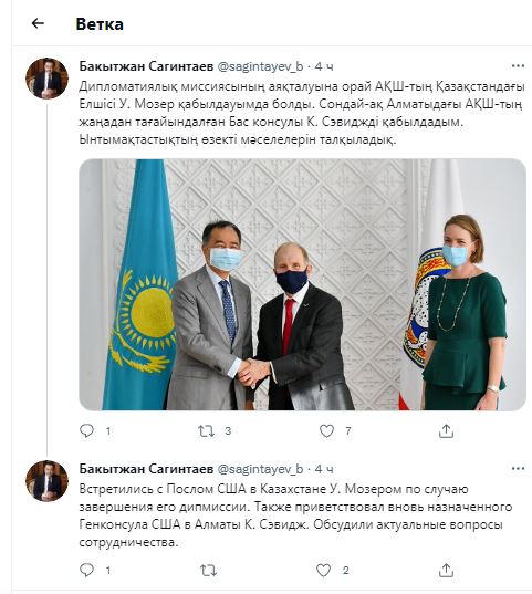 Градоначальник провел встречу с покидающим пост посла США в Казахстане Уильямом Мозером. Кроме того, аким поприветствовал нового генконсула США в Алматы Кэролайн Сэвидж.