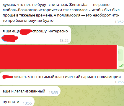 Получается, в казахстанской полиаморной среде нет однозначного мнения на этот счёт. Возможно, одна из причин — разночтение терминов.