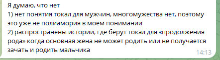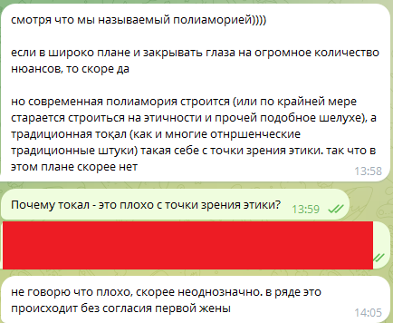 Разберёмся же в понятиях. Полиаморией называют форму согласованной немоногамии, это система этических взглядов на любовь, которая допускает возможность существования любовных отношений у одного человека с несколькими людьми одновременно с их согласия. Момент согласия — один из ключевых для того, чтобы отношения с несколькими людьми могли называться полиаморными, а не изменой в рамках закрытых моногамных отношений. По этой формулировке, в случае если первая жена не против, то для мужчины, который возьмёт токал, отношения станут полиаморными.