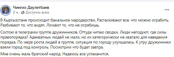"В Кыргызстане происходит банальное мародерство. Растаскивают все, что можно ограбить. Разбивают то, что видят. Ломают то, что не ограбишь. Состою в telegram-группе дружинников. Читаю сводки. Люди негодуют: где силы правопорядка? Адекватных людей немало, но их категорически не хватало для наведения порядка", — написал казахстанец Чингиз Даулетбаев.