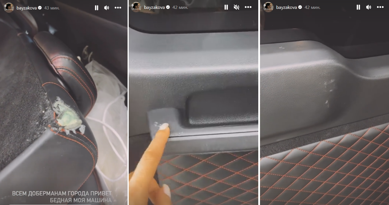 "Смотрите, что сделал Хан. Привет собакам. Всем. И представляете, я только заметила, он разгрыз всю мою машину. Гений!" — сказала Айжан, показав повреждения в сториз.