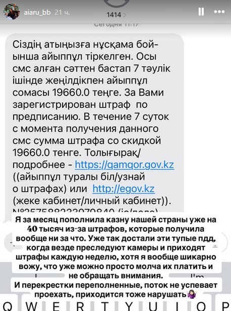 Айару Бакытбек, младшая дочь Баян Алагузовой, недовольна ситуацией на дорогах, сообщает Caravan.kz. Девушка загрузила в сторис скриншот уведомления о штрафе и добавила эмоциональную подпись, в которой, впрочем, признала, что нарушает правила и знает об этом.