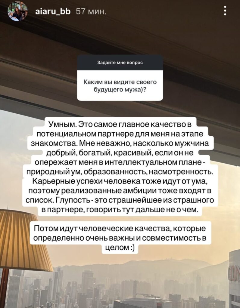 Потом идут человеческие качества, которые определенно очень важны, и совместимость в целом«, — поделилась Айару.