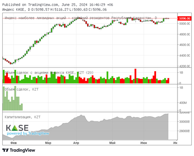 Из графика, взятого с сайта Казахстанской фондовой биржи, видно, что за последние полгода фондовый рынок в стране даже вырос.