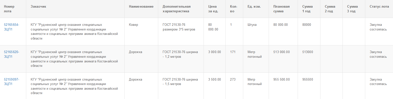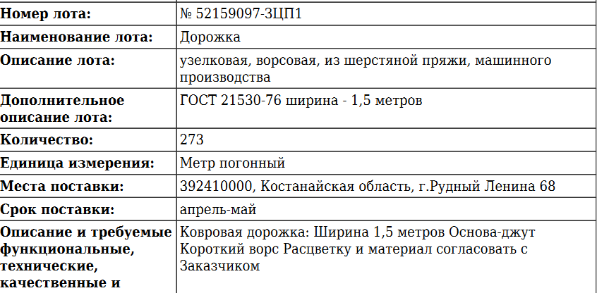 Рудненский центр оказания специальных социальных услуг № 2 заказал 444 погонных метра ковровых дорожек разной ширины, а также ковер размером 3 на 5 м.