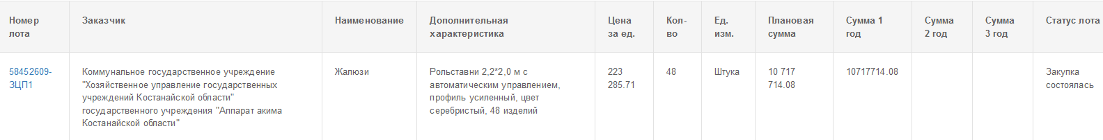 Аппарат акима Костанайской области также сделал примечательную госзакупку. Чиновники приобрели 48 серебристых укрепленных рольставней размером 2,2 на 2,0 м c автоматическим управлением.