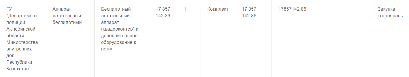 Закупкой дорогостоящей техники также отличились в департаменте полиции Актюбинской области. Правоохранители опубликовали тендер на приобретение квадрокоптера и дополнительного оборудования к нему. На это было выделено 17 857 142 тенге.