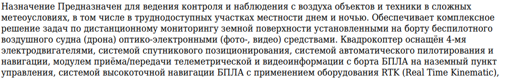 Победителем стало ТОО «Kaz Innovation Engineering», предложив цену в 14 285 713 тенге. Согласно техспецификации, силовым структурам беспилотник необходим для ведения наблюдения за объектами с воздуха в сложных метеоусловиях, в том числе в труднодоступных участках местности днем и ночью.