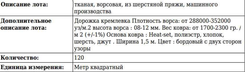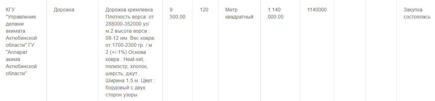 Интересный лот также появился в конце сентября от управления делами акимата Актюбинской области. В ведомстве планировали приобрести ковровую дорожку за 1 140 000 тенге.