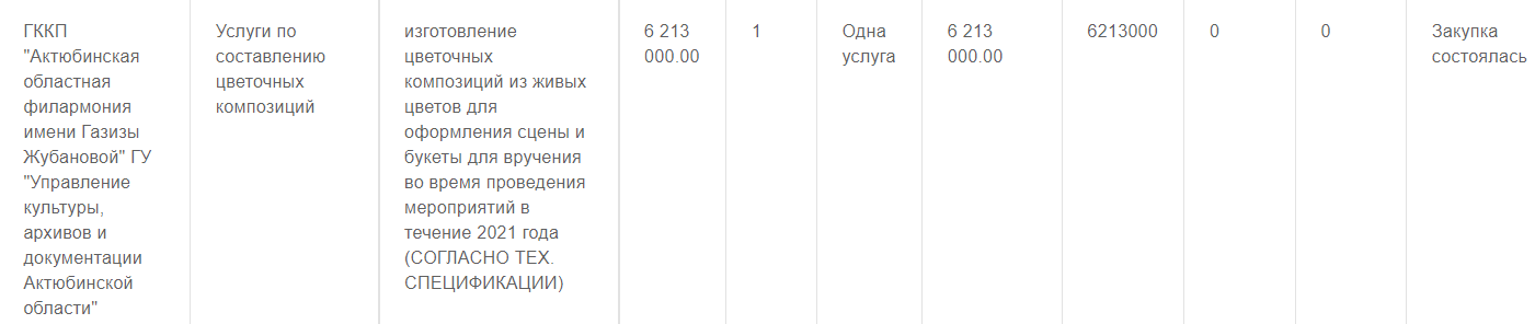 Далее мы обнаружили сразу три интересных тендера от Актюбинской областной филармонии имени Газизы Жубановой ГУ "Управление культуры, архивов и документации Актюбинской области". В январе сотрудники филармонии планировали приобрести услуги по изготовлению цветочных композиций за 6 213 000 тенге.
