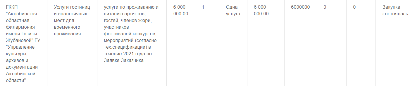 Затем в том же месяце был опубликован тендер на закупку услуг гостиниц и аналогичных мест для временного проживания, на это планировали выделить 6 000 000 тенге.