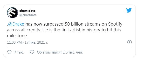 Дрейк установил новый музыкальный рекорд — он стал первым исполнителем в истории, набравшим 50 миллиардов прослушиваний на Spotify. Сейчас в стриминговом сервисе доступно двенадцать релизов канадского рэпера разных форматов, в том числе его дебютный мини-альбом «So Far Gone». Об этом пишет Buro247.ru со ссылкой на Hypebeast.