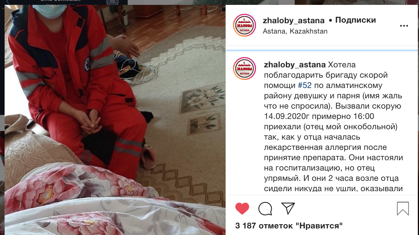 "Хотела поблагодарить бригаду скорой помощи №52 по Алматинскому району, девушку и парня (жаль, что не спросила имена). Вызвали скорую 14 сентября, приехали (отец мой онкобольной), так как у отца началась лекарственная аллергия после принятия препарата", — рассказывает участница столичного паблика.