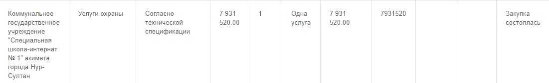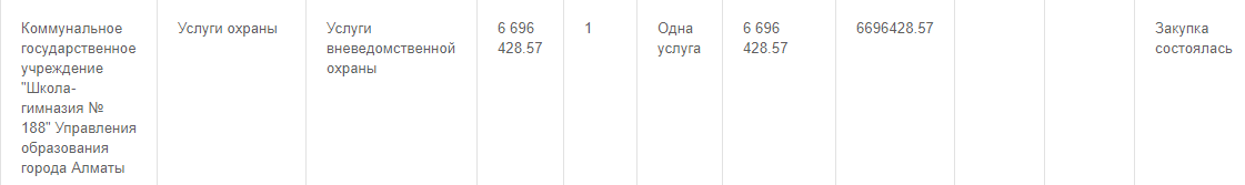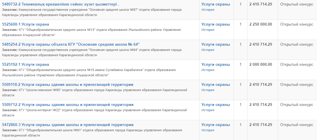 Кроме того, стоит обратить внимание, как сейчас обеспечиваются услуги охраны в школах страны. По данным сайта госзакупок, большинство учебных заведений могут позволить себе потратить на услуги охраны от 2 до 3 миллионов тенге.