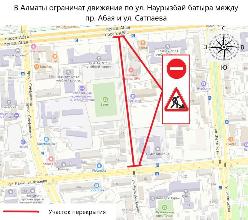 — с 22.00 21 июня до 12.00 23 июня по улице Наурызбай батыра от проспекта Абая до улицы Сатпаева.