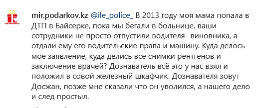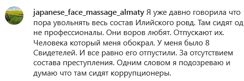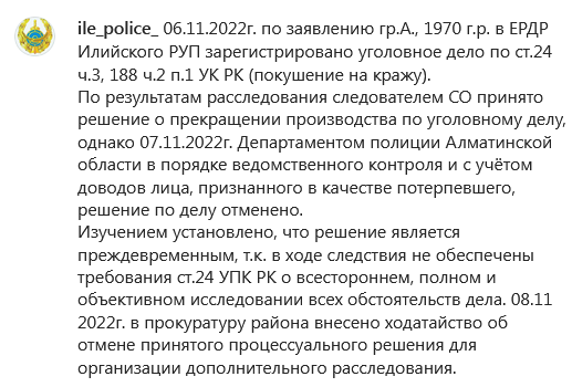 Так вот, по закону им должна применяться статья 188, ч. 2 , а факту их просто отпустили и закрыли дело, к большому сожалению. Вот так вот работает полиция Илийского района, кто даёт такие распоряжение, начальники или следователи, нам неизвестно.Просим соответствующие органы обратить внимание на этот беспредел, также начать внутреннюю проверку в нашем Илийском РУП", — сообщил местный блогер.