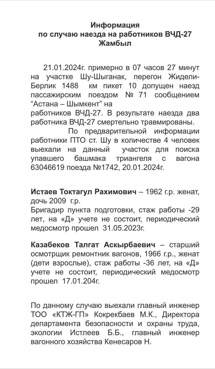 Пресс-служба компании сообщает, что АО «НК «Қазақстан темір жолы» окажет необходимую помощь семьям погибших работников, но конкретные меры не называет.