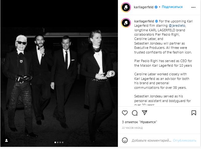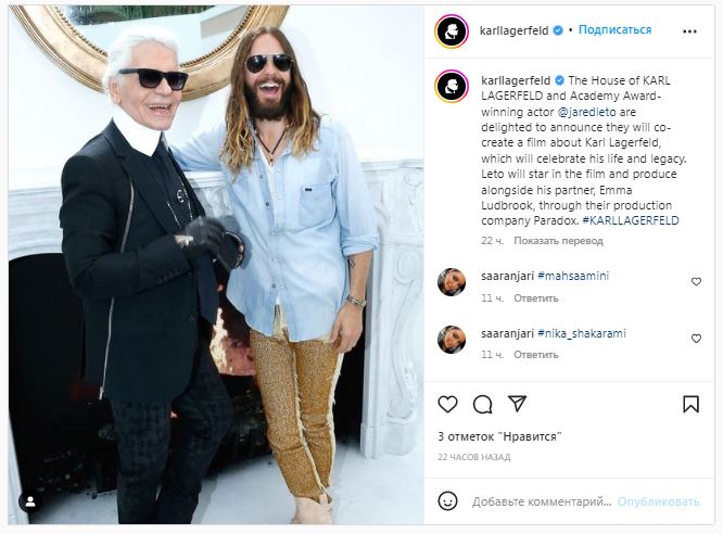 Как сообщает Джаред Лето в своем интервью WWD, однажды он сказал Лагерфельду: «Я должен сыграть Вас в кино». На что дизайнер ответил: «Только ты, дорогой, только ты».