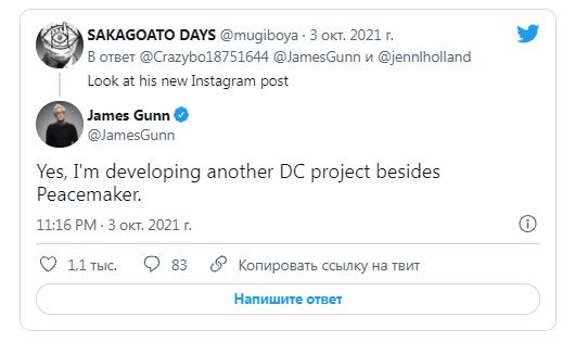 Название и сюжет Ганн раскрывать не стал. Однако режиссер пояснил, что новинка находится на ранней стадии разработки. Таинственный проект не будет анонсирован на мероприятии DC FanDome 2021, которое состоится 16 октября. Как и «Миротворец», новая история из расширенной вселенной будет разработана специально для HBO Max. Некоторые фолловеры Ганна поинтересовались, не будет ли загадочный сериал посвящен сражению Дэдшота и Бладспорта, на что режиссер ответил отрицательно.