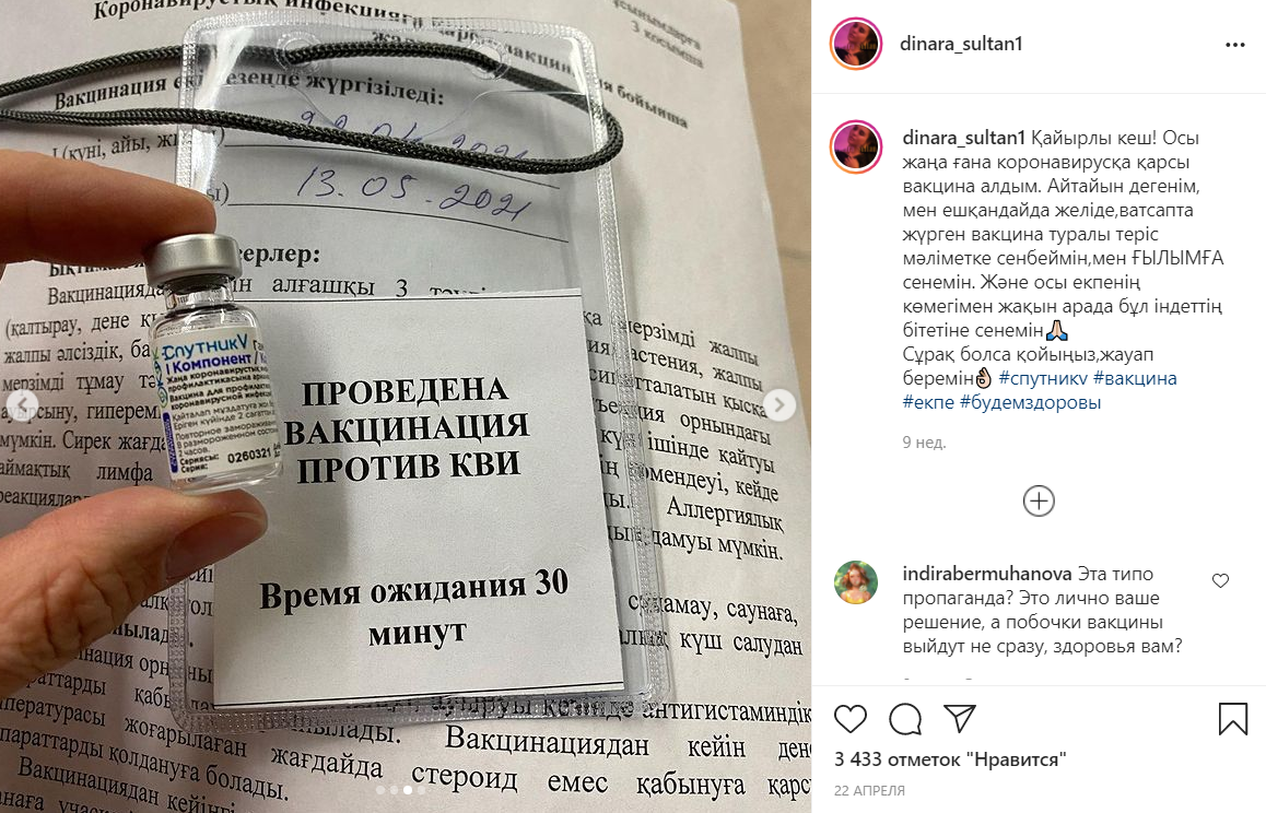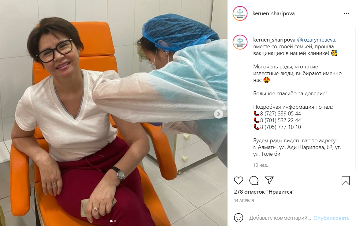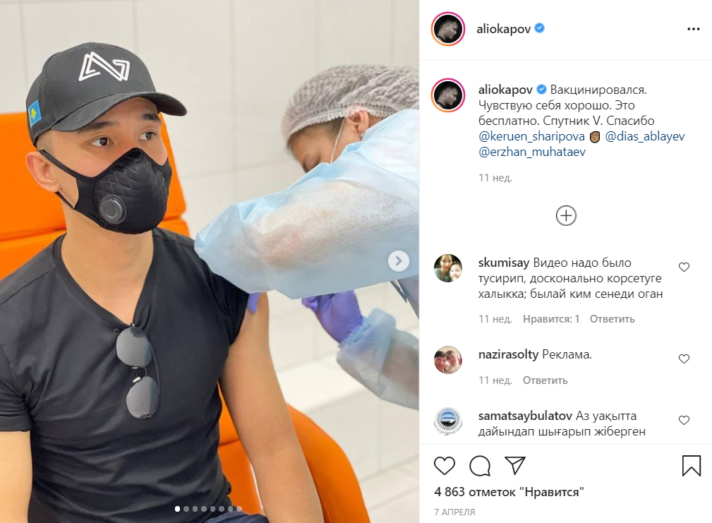 Как сообщали СМИ, о том, что вакцинацию прошли артистка Роза Рымбаева и ее сын певец Али Окапов, можно было узнать из социальных сетей. Вместо зрительного зала в начале апреля творческую семью ждал прививочный кабинет в одной из поликлиник Алматы.