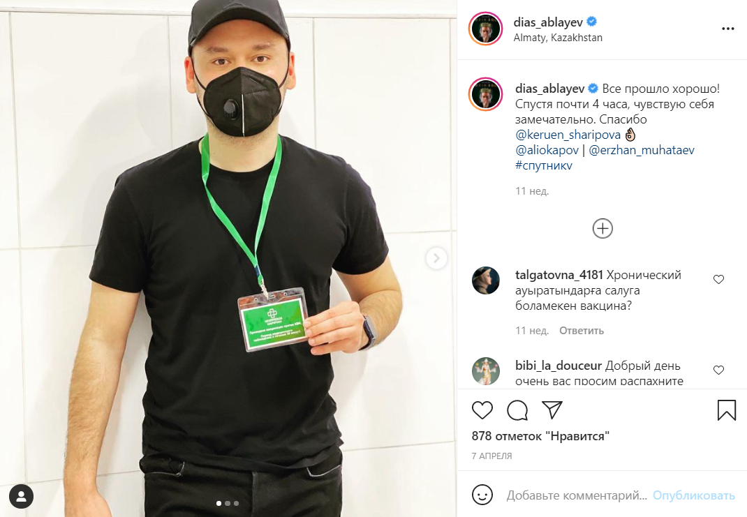 В тот же день вместе с Розой Рымбаевой и Али Окаповым вакцинировался другой популярный певец — Диас Аблаев, о чем он также рассказал в соцсетях.