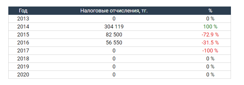 В том же сервисе доступна таблица по налоговым отчислениям АО "РКК "Байконур", по которой с 2015 года наблюдается спад.