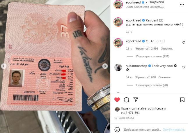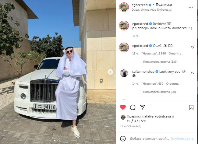 В социальной сети 27-летний исполнитель опубликовал фотографию своего паспорта с видом на жительство в ОАЭ. На другом снимке — Егор Крид позирует в традиционной арабской одежде — белой кандуре.