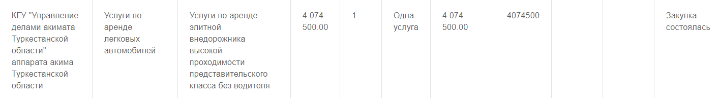 На фоне вливаний колоссальных сумм в развитие региона местные власти не забывают и о собственном благосостоянии. Например, в 2020 году управление делами акимата Туркестанской области выделило 4 074 500 тенге на аренду элитного внедорожника представительского класса.